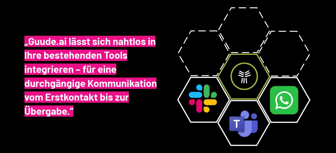 - Kommunikation: Über Telefon und – dank einfacher API-Anbindung – auch über andere gängige Kommunikationstools wie Microsoft Teams, Slack, WhatsApp oder Messenger.